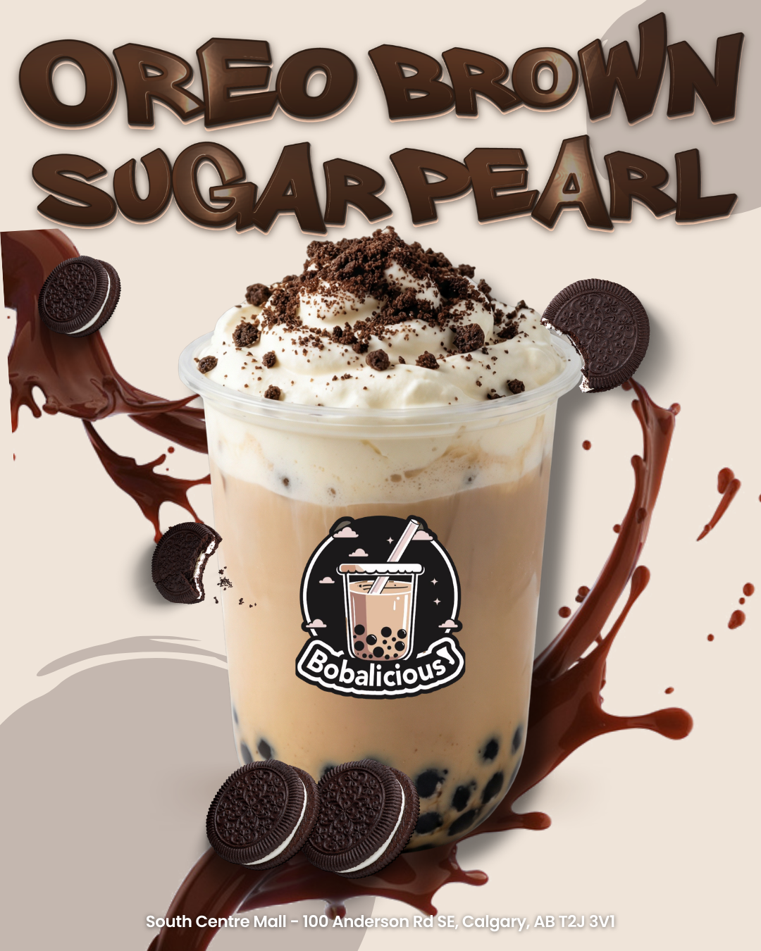 Crushed Oreo cookies meet brown sugar pearl milk, topped with whipped cream and cookie crumbles.